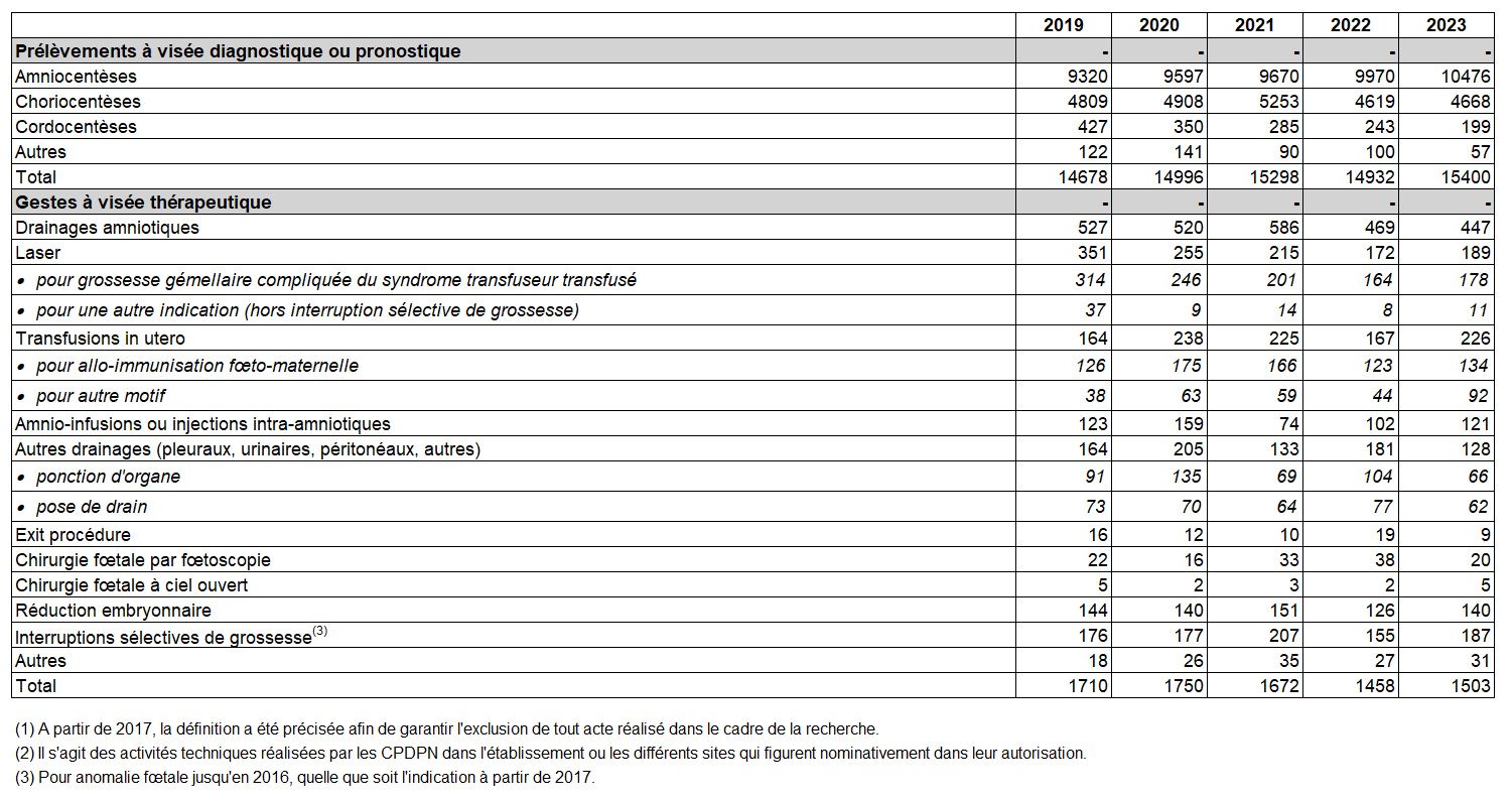 Concernant les actes techniques (Tableau CPDPN17), 15 400 prélèvements à visée diagnostique ou pronostique ont été réalisés, et 1 503 gestes à visée thérapeutique.