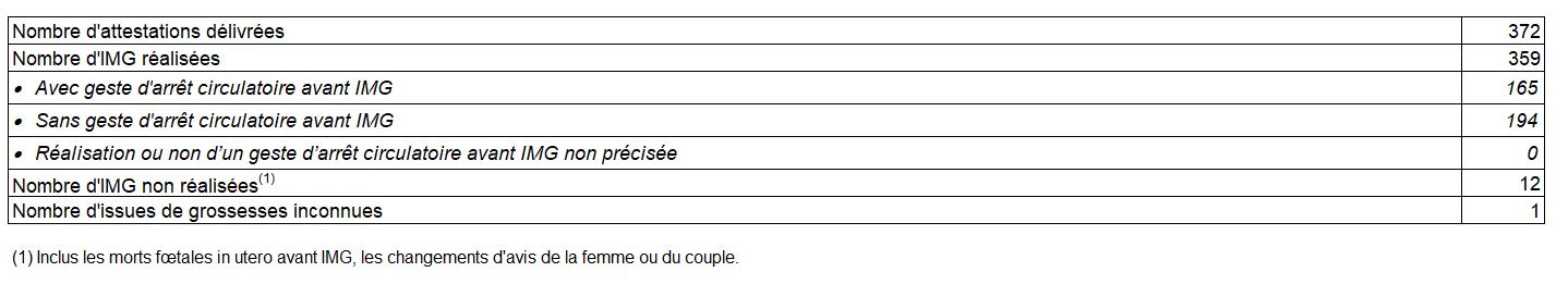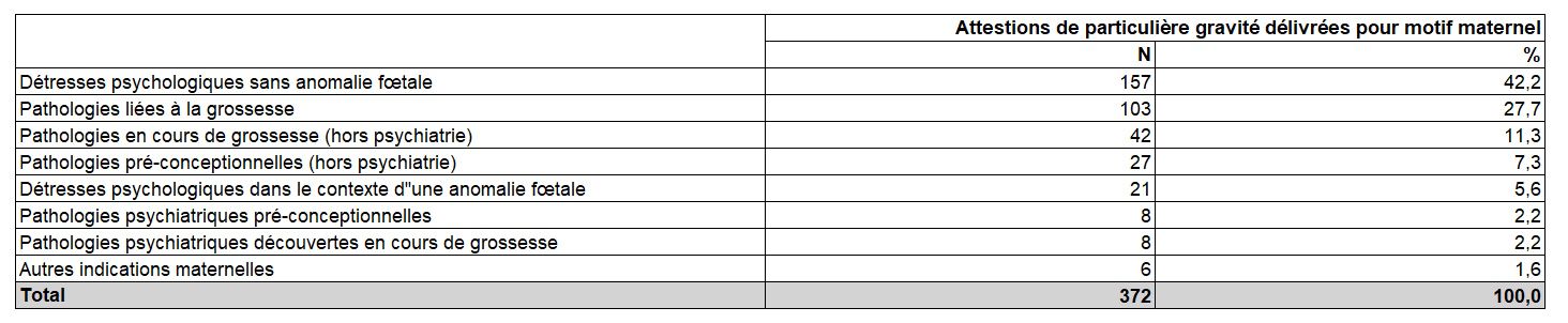 A partir du recueil de l’activité 2019 des CPDPN, l’information relative au suivi des grossesses après délivrance d’une attestation de particulière gravité pour motif maternel est disponible (Tableau CPDPN13). Une IMG est réalisée dans 96,5 % (359/372) des situations où une attestation de particulière gravité a été délivrée pour motif maternel. Une IMG n’est pas pratiquée dans 3,2 % (12/372) des cas, incluant un changement d’avis de la femme ou une mort fœtale in utero avant le geste d’IMG. L’issue de grossesse n’est pas connue dans 1/372 des situations.