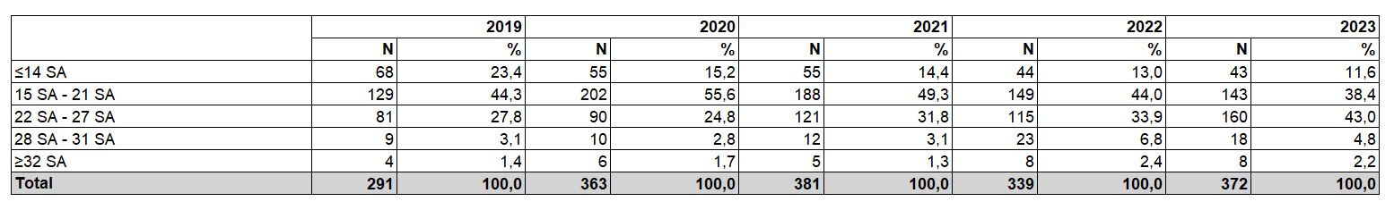 Ces attestations de particulière gravité ont été délivrées après 28 SA dans 7 % des cas, dont 4,8 % des cas entre 28-31 SA (Tableau CPDPN12). Bien que faible, cette part a diminué après avoir doublé en 2022 par rapport aux données de 2021.
