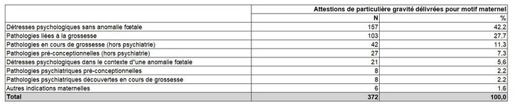 L’analyse des indications ayant conduit à la délivrance de l'attestation (Tableau CPDPN11) montre que près de la moitié des situations sont en lien avec une détresse psychologique sans anomalie fœtale (42,2 %). Les pathologies liées à la grossesse représentent 27,7 % des attestations et les pathologies maternelles (hors psychiatrie) pré-conceptionnelles ou diagnostiquées en cours de grossesse 18,6 %.