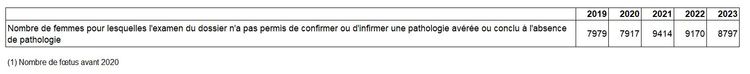Les grossesses pour lesquelles l'examen du dossier n'a pas permis de confirmer ou d'éliminer une pathologie fœtale (par exemple investigations complémentaires en cours au moment de la survenue de l'issue de grossesse) ;