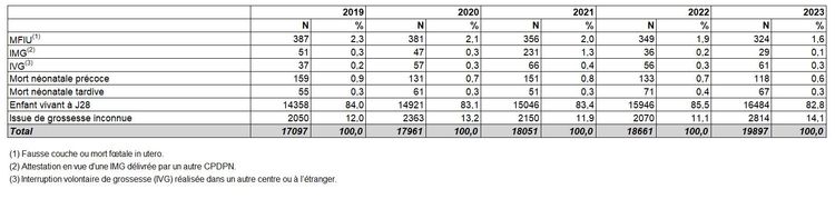 Par ailleurs, on identifie que pour 96,5 % des cas où l’issue de grossesse est connue, le nourrisson est vivant au 28e jour de vie. Le taux de mort fœtale in utero y est de 1,9 %, celui des morts néonatales précoces ou tardives de 1,8 %, le taux d’IVG 0,4 % et le taux d’IMG autorisées par un autre CPDPN 0,2 % (Tableau CPDPN3).