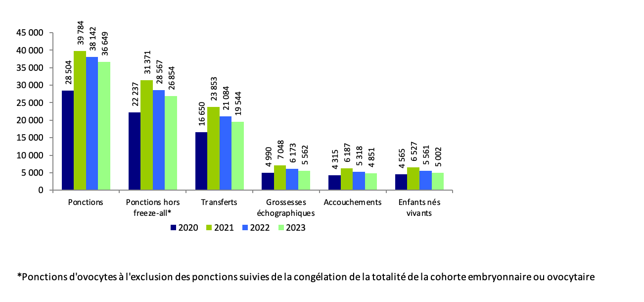 Figure AMP24. TEC en intraconjugal : décongélations, transferts, grossesses, accouchements et enfants nés vivants de 2020 à 2023