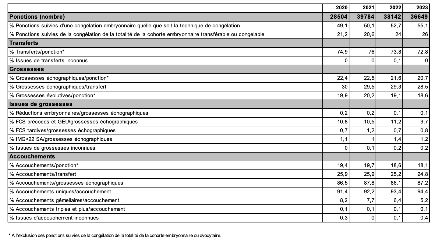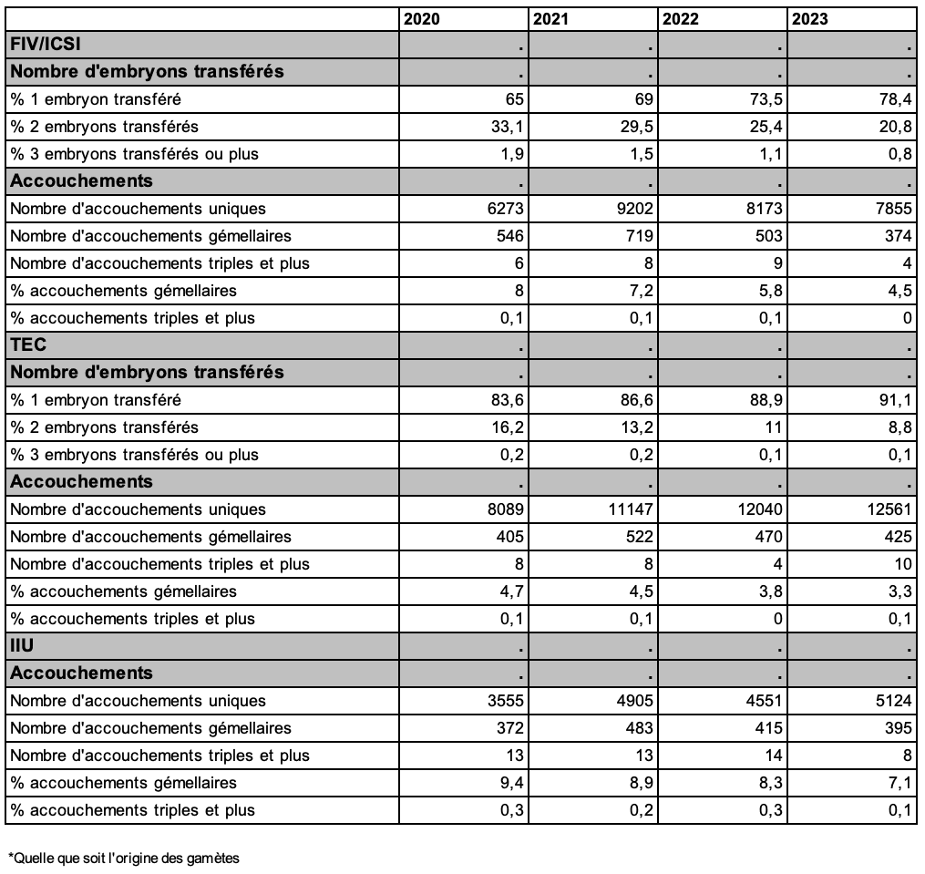 En 2023, le transfert mono-embryonnaire représente 82,82 % des transferts d’embryons frais (tableau AMP14). Ces transferts souvent sélectifs, en augmentation constante (68,91 % en 2020), ont conduit à une diminution du taux d’accouchements multiples (3,6 % en 2023 vs 7,4 en 2020, tableau AMP13). Le taux d’accouchement par ponction FIV hors ICSI baisse progressivement depuis 2021, passant de 20,1% à 19,4% puis à 18,7 % en 2023 avec néanmoins un maintien du taux d’accouchement par transfert à 25,8 % en 2023 (tableau AMP13). La diminution des taux d’accouchement par ponction est à investiguer davantage car ils suggèrent que les femmes prises en charge auraient un moins bon pronostic, ce qui pourrait être dû à l’augmentation de l’âge de prise en charge ou du recours plus fréquent au freeze-all pour les femmes jeunes dont les résultats se retrouvent ainsi exclus du taux d’accouchement par ponction. Cependant, lorsqu’on analyse les taux de grossesse cumulés, ils augmentent chaque année et étaient de 30 % en 2022 (Rapport d’évaluation national).