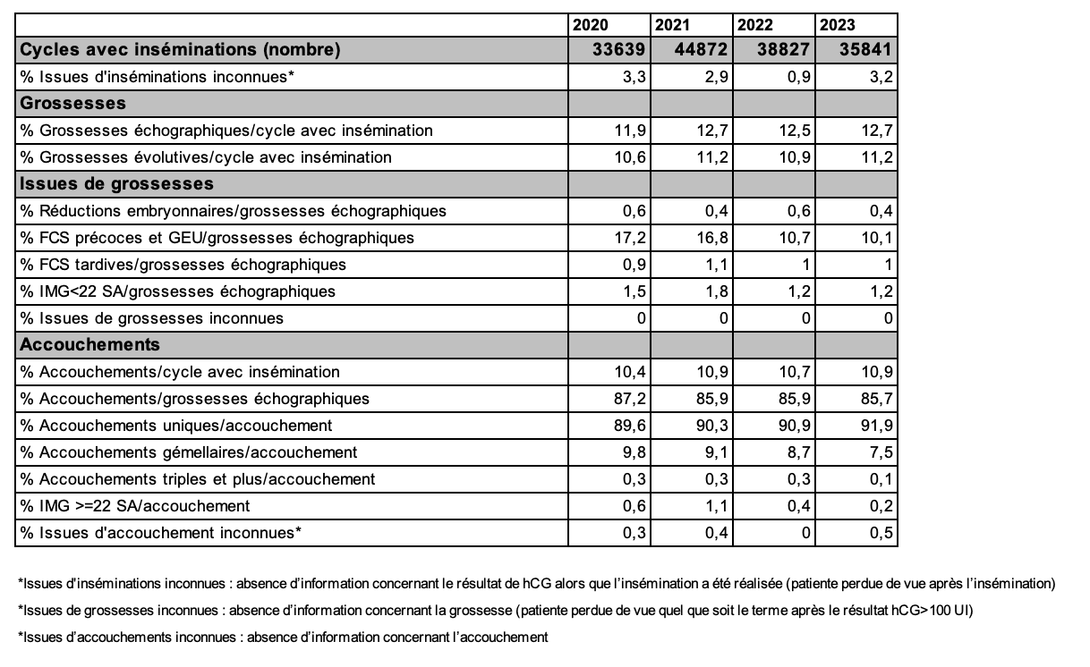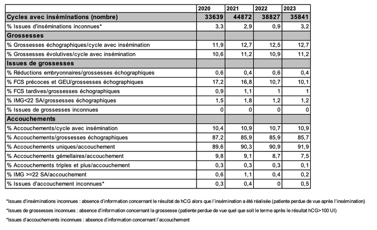 Tableau AMP9. Insémination intra-utérine avec les spermatozoïdes du conjoint : grossesses, issues de grossesses et accouchements de 2020 à 2023