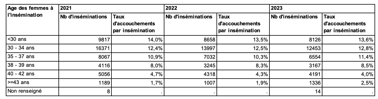 Tableau AMP11. Insémination intra-utérine avec les spermatozoïdes du conjoint : taux d'accouchements par insémination de 2020 à 2023 selon l'âge des femmes à l'insémination