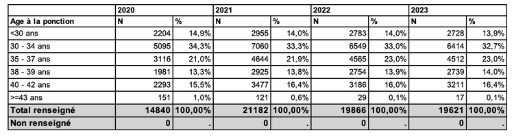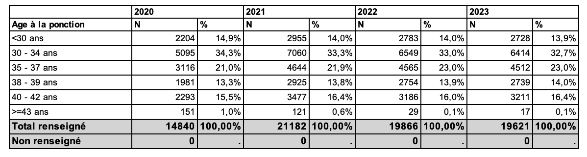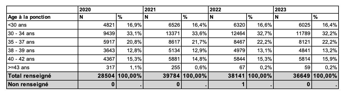 Tableau AMP12. FIV hors ICSI avec ovocytes et spermatozoïdes du couple: répartition de l'âge des femmes à la ponction de 2020 à 2023