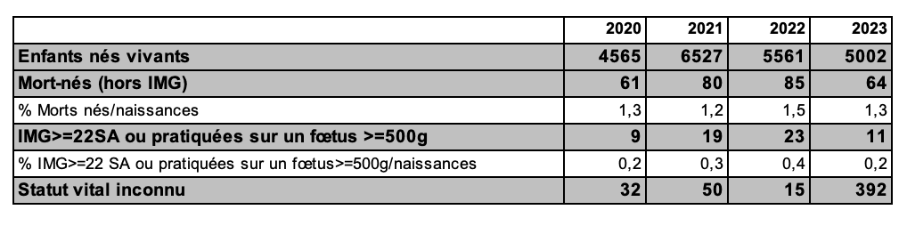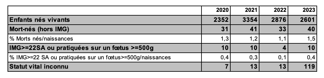 Tableau AMP36. TEC avec ovocytes et spermatozoïdes du couple : issues d'accouchements de 2020 à 2023