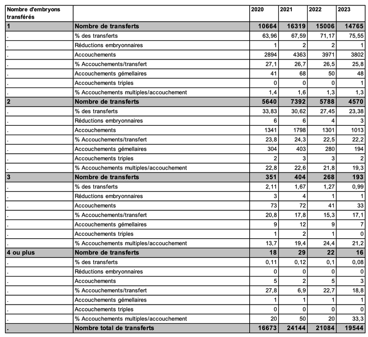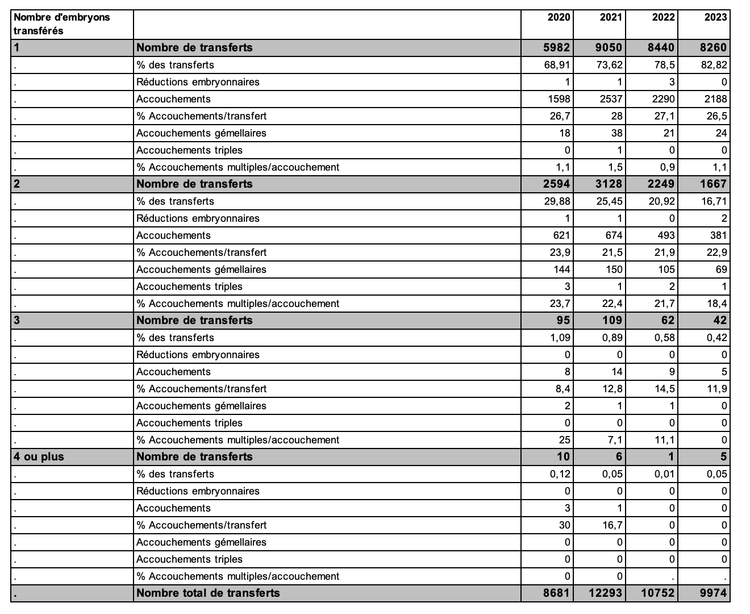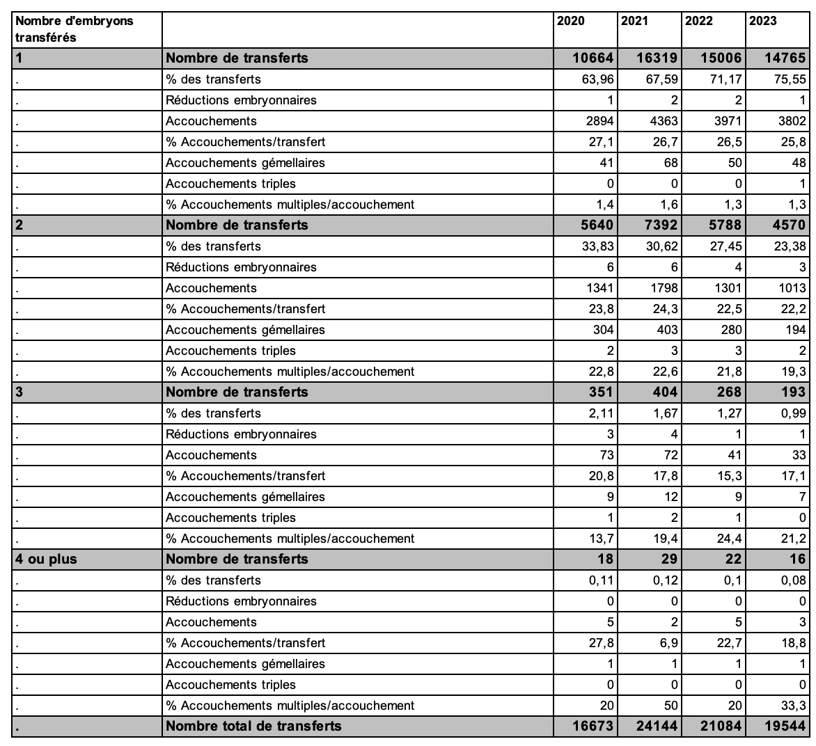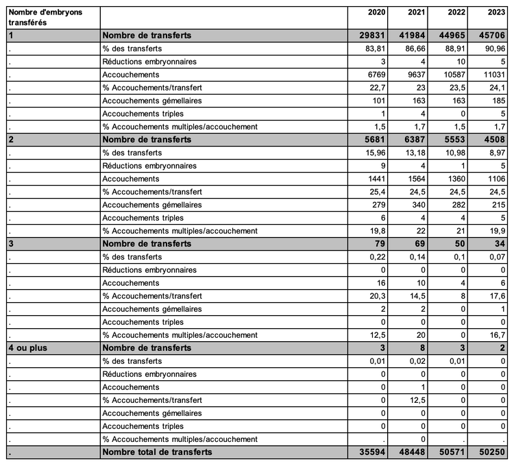 La stratégie de transfert unique est majoritaire : le transfert mono embryonnaire représente 90,96 % des transferts d’embryons congelés de 2023 (tableau AMP33), et le taux de grossesses multiples est inférieur à 4 % (tableau AMP32).