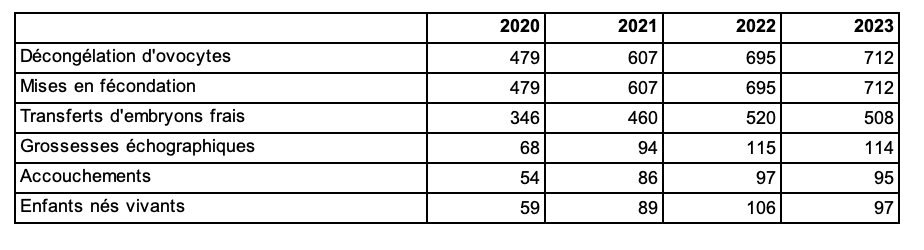 Les résultats de la technique de vitrification ovocytaire sont en progression par rapport aux années antérieures. Au cours de l’année 2023, 712 tentatives réalisées en intraconjugal après utilisation d’ovocytes réchauffés ont permis la naissance de 97 enfants (tableau AMP27).