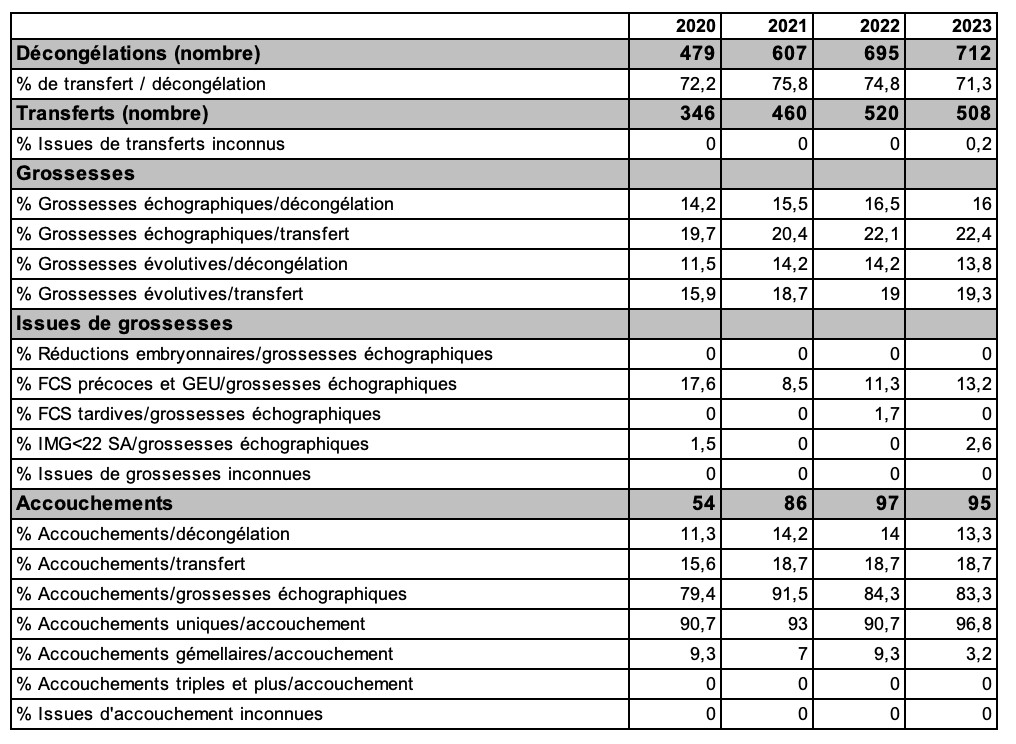 En 2023, le taux de fécondation reste stable à 59,6 % lors de la mise en fécondation par rapport au nombre d’ovocytes inséminés avec une augmentation du taux d’implantation suite à un transfert frais à 26 % en 2023 contre 25,2% en 2022 (Tableau AMP15).