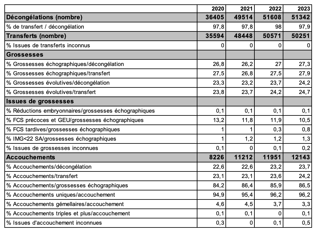 Les taux d’accouchement par cycle de décongélation continuent d’augmenter 23,7 % en 2023 probablement en lien avec la pratique de la culture prolongée (85,9 % des TEC en 2023 versus 75,1 % en 2020, tableau AMP92) et à la sélection des bonnes répondeuses, pour lesquelles le recours au transfert différé après congélation de toute la cohorte fait partie des bonnes pratiques. Par ailleurs, le taux des arrêts précoces du développement embryonnaire continue de diminuer 10,5 % en 2023 versus 13,2 % en 2020 (tableau AMP32). Enfin, l’analyse des protocoles de préparation endométriale n’est pas possible en exhaustivité mais a un probable impact sur les taux d’accouchement. Ainsi, il serait intéressant de pouvoir analyser les résultats en fonction des protocoles de préparation endométriale.