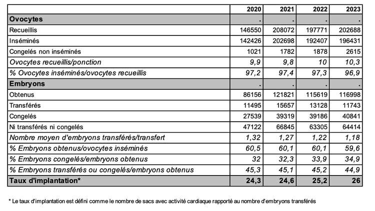 Le taux d’implantation par embryon transféré se stabilise à 17,6 % en 2023 (tableau AMP30) mais reste inférieur à celui des embryons obtenus à partir d’ovocytes frais (26 % et 23,7 % respectivement en FIV et en ICSI intraconjugal) et la possibilité d’un transfert n’est pas garantie, seules 71,3 % des tentatives de décongélations ovocytaires aboutissent à la réalisation du transfert d’au moins un embryon avec une moyenne d’ovocytes décongelés de 6,4 par tentative (tableau AMP28, tableau AMP30).