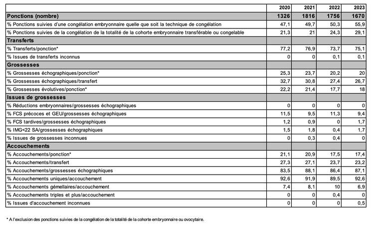 Tableau AMP14. FIV hors ICSI avec ovocytes et spermatozoïdes du couple : nombre d'embryons transférés, réductions embryonnaires et accouchements de 2020 à 2023