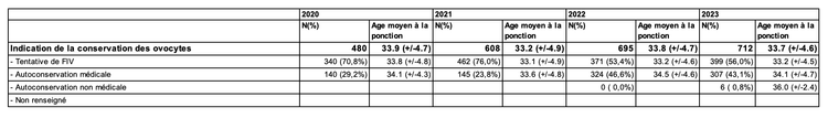 Cette partie présente des indicateurs sur les tentatives de fécondation in vitro réalisées à partir de cohorte d’ovocytes réchauffés pendant la prise en charge en AMP, quelle que soit l’indication de la vitrification des ovocytes et le moment auquel ils ont été vitrifiés.