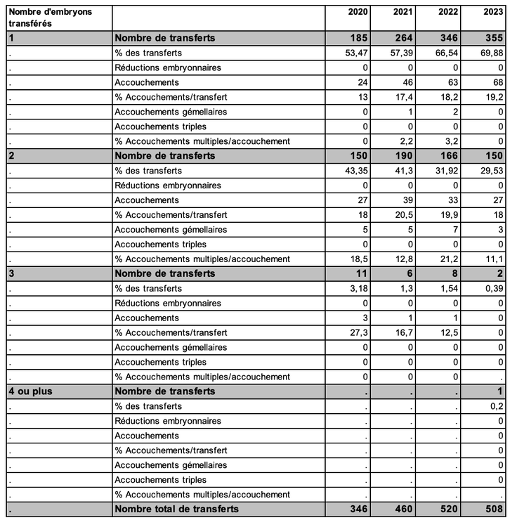 Comme observé lors de l’utilisation des ovocytes frais, la stratégie de transfert des embryons obtenus à partir d’ovocytes réchauffés confirme l’augmentation du transfert d’un seul embryon 69,88 % en 2023 versus 53,47 % en 2020 (tableau AMP29), ce taux reste inférieur pour les techniques « plus maîtrisées » 82,8 % en FIV et 75,5% en ICSI.
