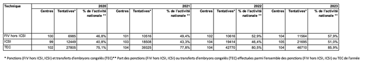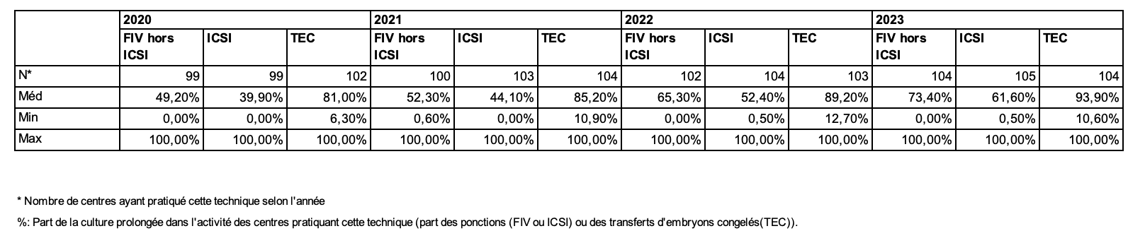 Les tentatives étudiées concernent uniquement celles pour lesquelles il n’y a eu que des blastocystes transférés et/ou décongelés. Les données transmises ne permettent pas de comptabiliser les tentatives avec intention de culture prolongée, au cours desquelles aucun blastocyste n’a été obtenu ou au cours desquelles on a renoncé à cette culture prolongée.