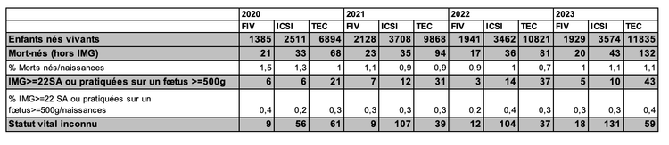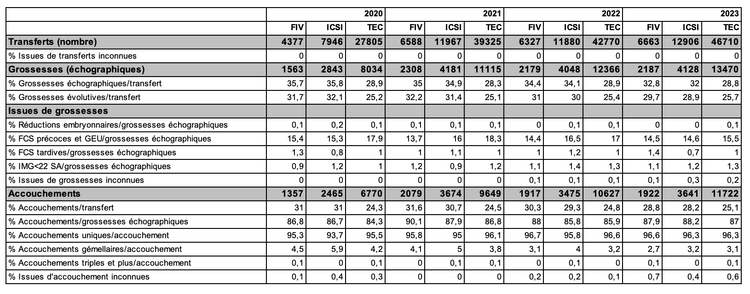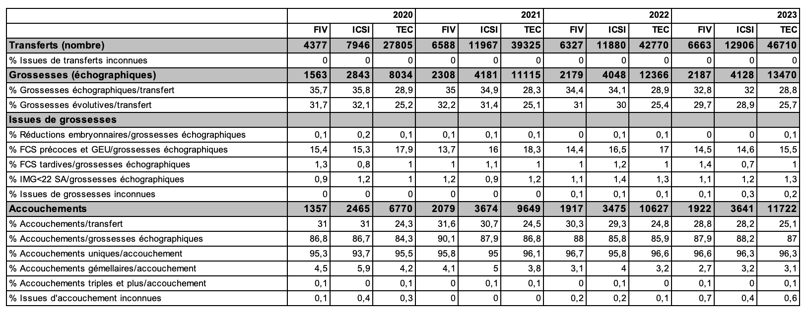 Les taux d’accouchement par transfert sont de 28,8 % après FIV, 28,2 % après ICSI et 25,1 % après TEC. Entre 2020 et 2023, alors que le taux d’accouchement a légèrement augmenté après TEC, passant de 24,3% à 25,1%, il diminue progressivement chaque année après transfert d’embryons frais (FIV, ICSI : respectivement 31 à 28,8% et 31 à 28,2%). Cette tendance à l’amélioration après TEC pourrait être expliqué par la diminution des FC précoces et tardives observées au fil des années après obtention d’une grossesse avec activité cardiaque (17,9% en 2020 contre 15,5% en 2023, Tableau AMP94).