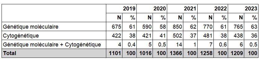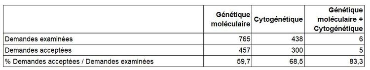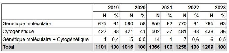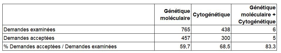 Au total, 59,7 % des demandes de génétique moléculaire et 68,5 % des demandes de cytogénétique examinées ont pu être acceptées en 2023, ainsi que 5 des 6 demandes formulées de DPI associant génétique moléculaire et cytogénétique (Tableau DPI7).