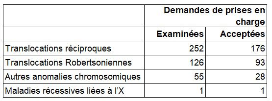 La répartition par indication des demandes examinées en cytogénétique est présentée dans le Tableau DPI8, montrant qu’une seule demande avec une maladie récessive liée à l’X impliquant un sexage a été faite et acceptée. Concernant les translocations, le taux d’acceptation des demandes pour les translocations robertsoniennes (73,8 %, 93 demandes acceptées sur 126 examinées) est légèrement plus important que pour les translocations réciproques (69,8%, 176 demandes acceptées sur 252 examinées) ou pour les autres anomalies chromosomiques (50,9 %, 28 demandes acceptées pour 55 demandes), souvent plus complexes.