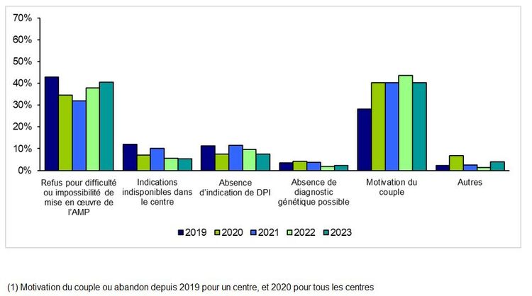 En 2023, la proportion de motifs de refus en lien avec une absence de « motivation du couple » représente en effet 40,3 % des situations (versus 43,5% en 2022). Il s’agit de dossiers de demande de DPI initialement établis, mais secondairement non complétés, malgré des sollicitations du couple par le centre de DPI (par exemple bilan hormonal ou gynécologique non réalisé ou dont les résultats ne sont pas transmis au centre de DPI). Cette option de comptabiliser les abandons de la démarche de DPI a été offerte à l’ensemble des centres à partir de l’année 2020.