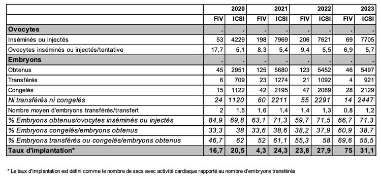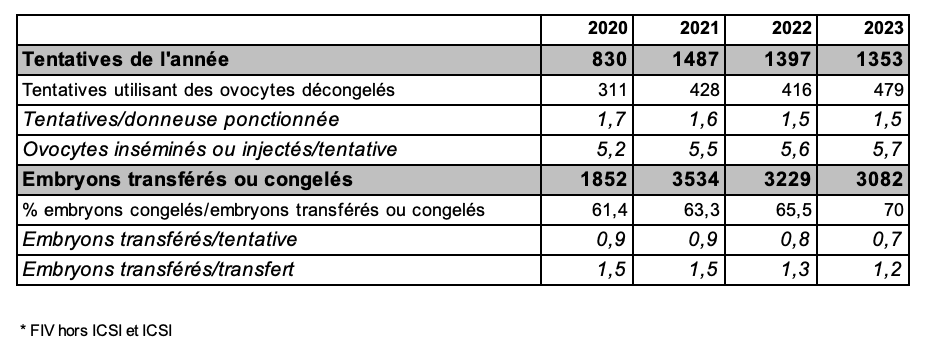 Un recours minime à la technique de FIV (hors ICSI) par rapport à l’ICSI pour le don d'ovocytes : seules 10 (0,7 % en 2023) mises en fécondation ont été réalisées à partir de cette technique au cours de l’année 2023. La technique d’ICSI a toujours été majoritaire, son recours s’impose dans le cadre d’une utilisation d’ovocytes préalablement vitrifiés, et permet une distribution équitable, des ovocytes matures obtenus après décoronisation.
