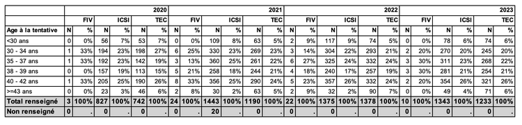 Une augmentation des tentatives réalisées à partir d’ovocytes dévitrifiés en 2023 par rapport à 2022 (tableau AMP38, 35,4 % en 2023 ; 29,2 % en 2022).