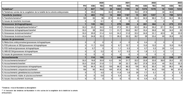Les 2 586 tentatives réalisées en 2023 ont permis la naissance de 520 enfants (Figures AMP27, AMP28 et AMP29, et tableau AMP40).