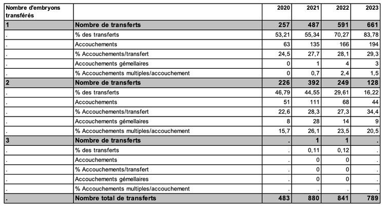 Tableau AMP42. ICSI avec don d'ovocytes : nombre d'embryons transférés et accouchements de 2020 à 2023