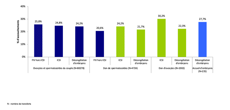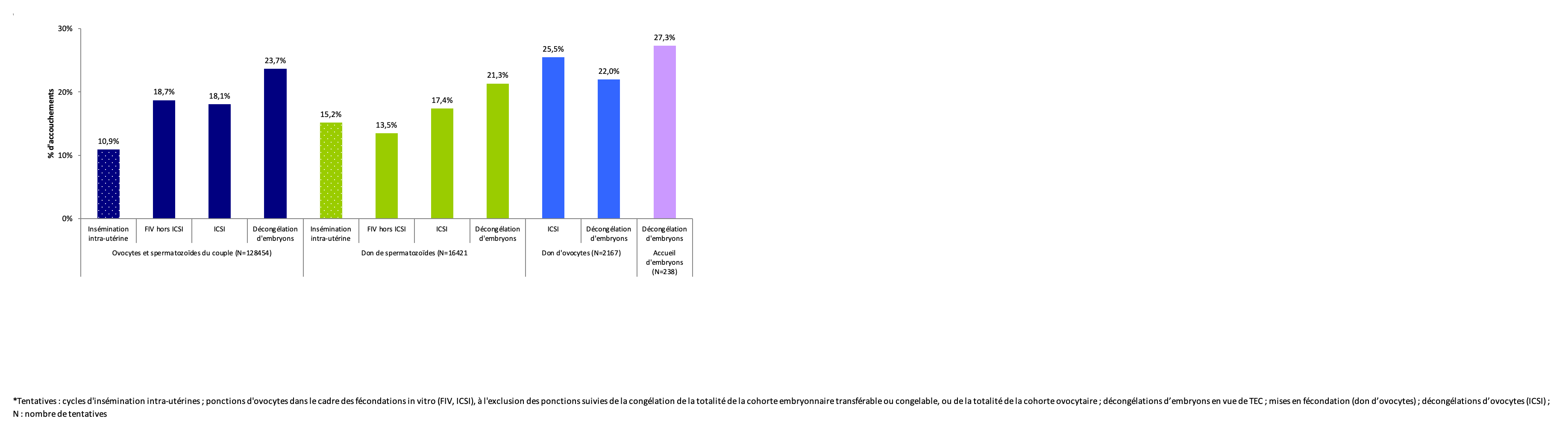 Les différences observées sur les taux de grossesse et d’accouchement en fonction des techniques et de l’origine des gamètes (figures AMP10 et AMP11) sont liées aux indications de ces différentes techniques d’AMP (causes de l’infertilité, pathologies associées, etc.), aux procédés eux-mêmes et aux caractéristiques des patients (âge, indice de masse corporelle…).