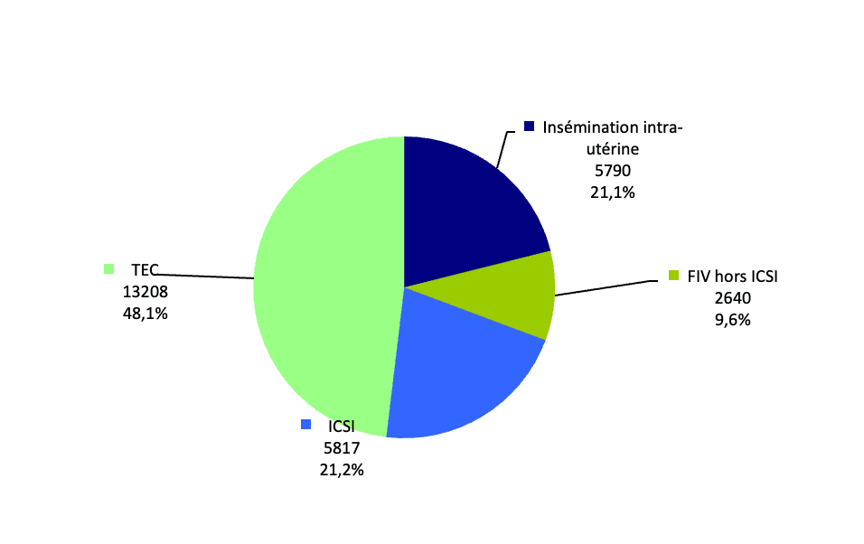 21,1 % (5 790 enfants) ont été conçus par insémination intra-utérine, technique d’AMP la plus simple à mettre en place, la moins invasive et la moins coûteuse. En hausse de 1,7 points (19,4 % en 2022), l’insémination intra-utérine vient ici confirmer sa place au sein des traitements de l’infertilité.