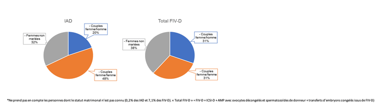 Figure AMP2. Statut matrimonial des personnes ayant eu recours à une AMP avec don de spermatozoïdes en 2023, par technique utilisée*