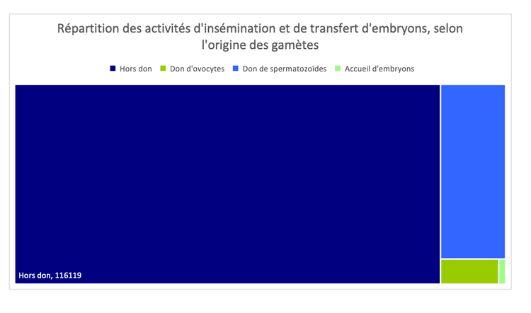 Les transferts d’embryons issus de tiers donneur de spermatozoïdes (FIV et IIU) et d’accueil d’embryons (n=7 043) ont permis en 2023, la naissance de 3 408 enfants, soit 12,4 % des enfants issus d’une AMP de 2023 (6,6% en 2022).
