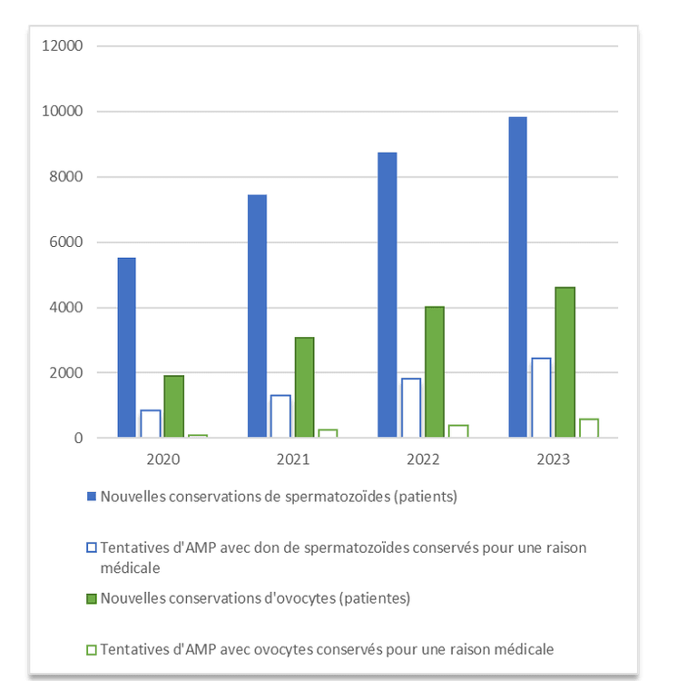 Un meilleur accès à la préservation médicale de la fertilité permis notamment par un nombre croissant de centres autorisés : annuellement le nombre de patients bénéficiant d’une conservation de gamètes en vue d’une préservation médicale de la fertilité visant à donner la possibilité de recourir à une AMP pour un projet parental ultérieur croit, évoquant que le recours à cette possibilité est facilité : 9 838 (7 443 en 2021, + 32 % par rapport à 2021), 4 621 (3 075 en 2021, + 50 %) de personnes ayant respectivement conservé leurs spermatozoïdes et leurs ovocytes.