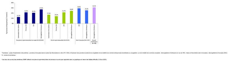 Le taux de succès après insémination avec spermatozoïdes de donneurs qui étaient ces 3 dernières années proche de 20 % diminue depuis 2022 (17 % en 2022, 15,2 % en 2023). Les taux succès en intraconjugal sont quant à eux stables (10 %).