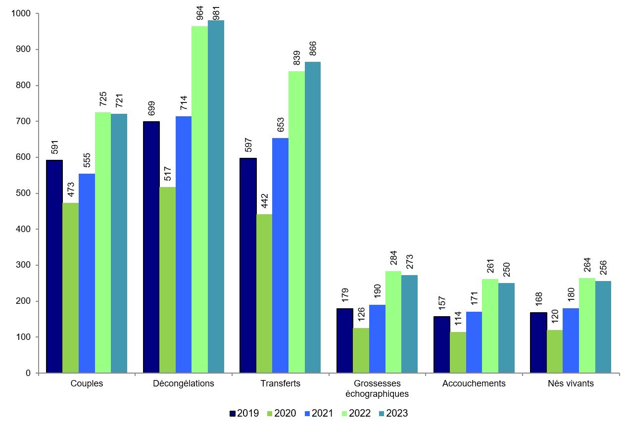 Tentatives d’AMP pour DPI avec transfert exclusif d’embryons congelés (Figure DPI8, Tableaux DPI18, DPI19 et DPI20) : Pour l’année 2023, 721 couples ont été pris en charge et 250 accouchements ont été rapportés avec 256 enfants nés vivants. En 2022, on notait 725 couples pris en charge et 261 accouchements avec 264 enfants nés vivants, soit en 2023 une légère diminution (-3%) du nombre d’enfants nés vivants. En 2019, on notait pour 591 couples, 157 accouchements avec 168 enfants nés vivants, soit une augmentation de +59,2% du nombre d’accouchements par rapport à cette année 2019 de référence.