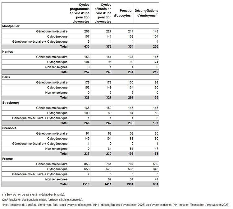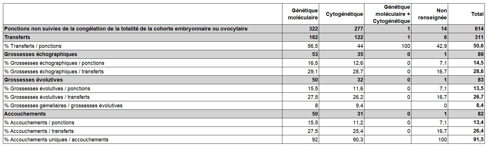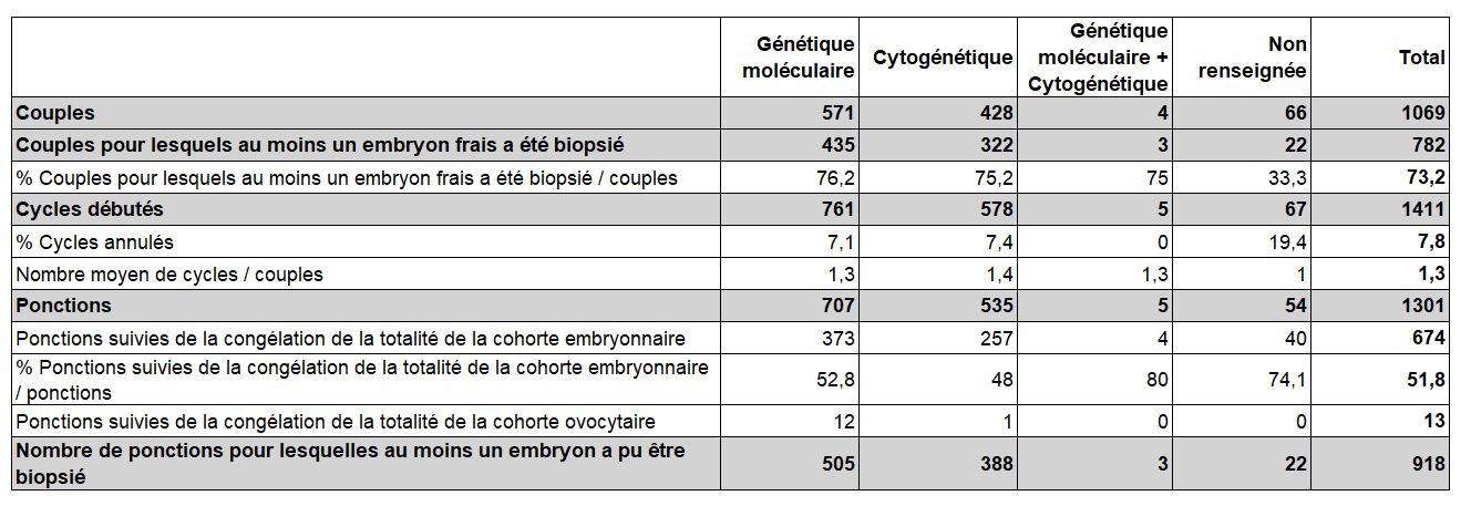 Cette pratique est principalement réalisée par 2 centres de DPI sur les 5 centres autorisés, une amélioration du recueil pourrait être envisagée afin de mieux évaluer cette pratique dans les centres de DPI.