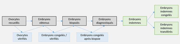 Selon les pratiques, les embryons peuvent être congelés avant ou après la réalisation de la biopsie de cellules qui vise à réaliser de diagnostic génétique.