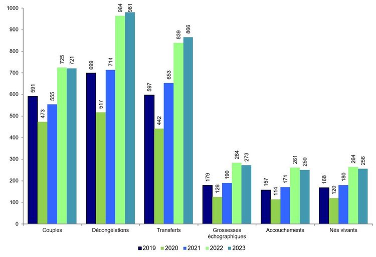 Figure DPI8. Evolution des tentatives d'AMP pour DPI avec transfert d'embryons congelés de 2019 à 2023
