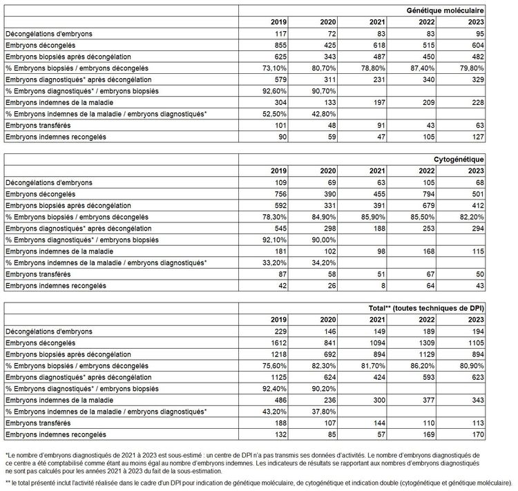 Tableau DPI19. Indicateurs de résultats d'AMP pour DPI en vue de transfert exclusif d'embryons congelés avant biopsie par technique en 2023