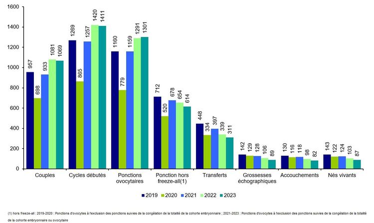 Figure DPI6. Evolution des tentatives d'AMP pour DPI avec transfert immédiat d'embryons ou transferts mixtes (frais et congelés) de 2019 à 2023