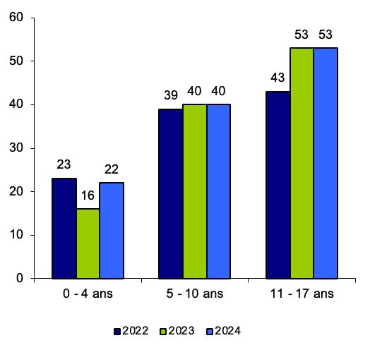 L’activité pédiatrique représente, en 2024, 6,3% de la totalité des prélèvements (Tableau CSH P1) soit 295 cytaphérèses chez 189 patients de moins de 18 ans (1,6 cytaphérèses par patient). Elle a été réalisée dans 23 unités de cytaphérèse.