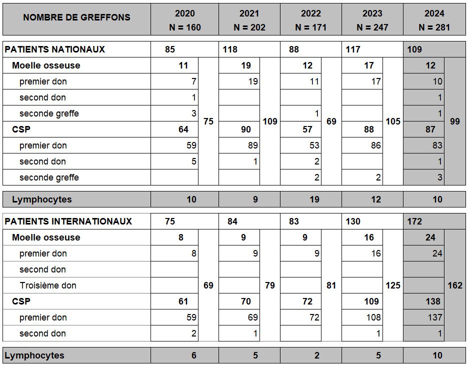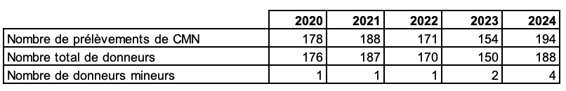 Concernant les prélèvements autologues de CSH réalisés en 2024, aucune comparaison n’a été effectuée avec le nombre de greffes autologues réalisées la même année, car les prélèvements autologues peuvent parfois être congelés plusieurs mois voire années avant d’être infusés.