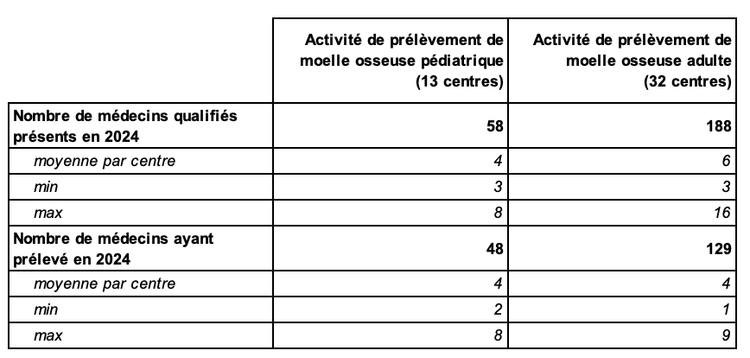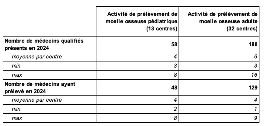 Les 13 centres ayant eu en 2024 une activité de prélèvement de moelle osseuse pédiatrique totalisent 58 médecins formés pour le prélèvement de moelle osseuse et 48 médecins ayant effectivement prélevé en 2024 (Tableau CSH P8).