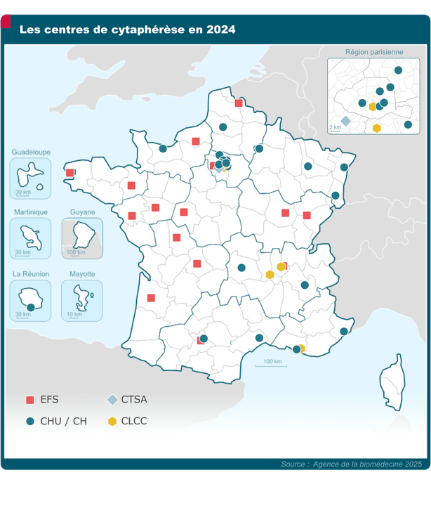Les prélèvements de cellules souches du sang périphérique, effectués par les unités de cytaphérèse autorisées (hospitalières ou EFS) ;