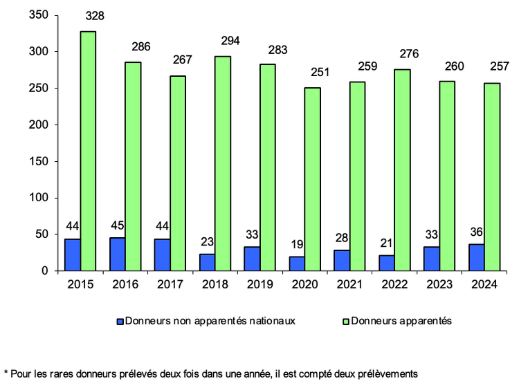 Le nombre de prélèvements de moelle osseuse apparentée, est resté stable en 2024 à 261.