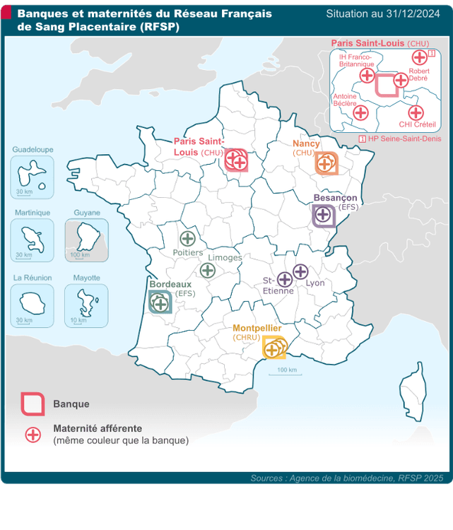 Créé en 1999, le Réseau Français de Sang Placentaire (RFSP) est constitué, à la fin 2024, de 5 banques de sang placentaire (BSP) actives : Besançon, Bordeaux, Montpellier, Nancy, Paris Saint-Louis, et de 16 maternités autorisées par les ARS à l’activité de prélèvement de greffons de sang placentaire, dont la maternité du CHU de Poitiers qui a repris son activité de prélèvement de sang placentaire en décembre 2024.