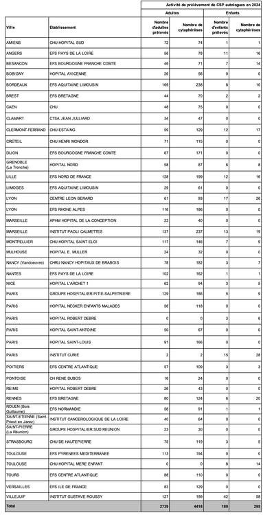 Tableau CSH P1. Activité de prélèvement de CSP autologues par centre en 2024