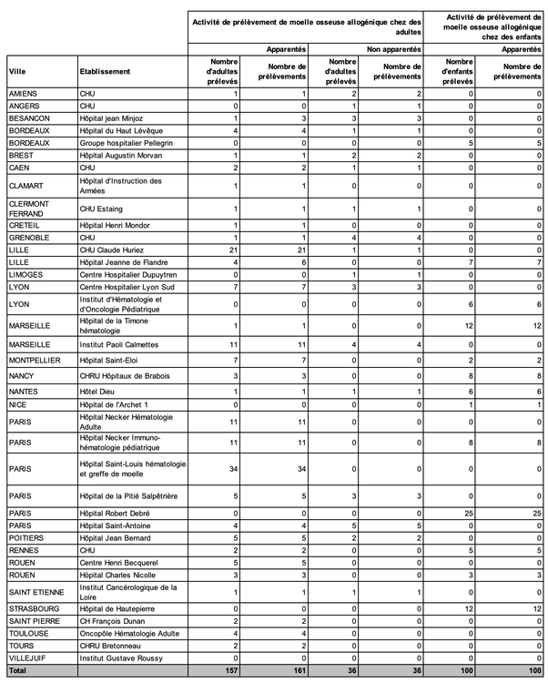 Les 38 centres autorisés au prélèvement de moelle osseuse ont rempli et renvoyé le questionnaire de prélèvement.