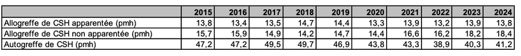 Tableau CSH R2. Evolution de l’activité de greffe de CSH rapportée à la population française